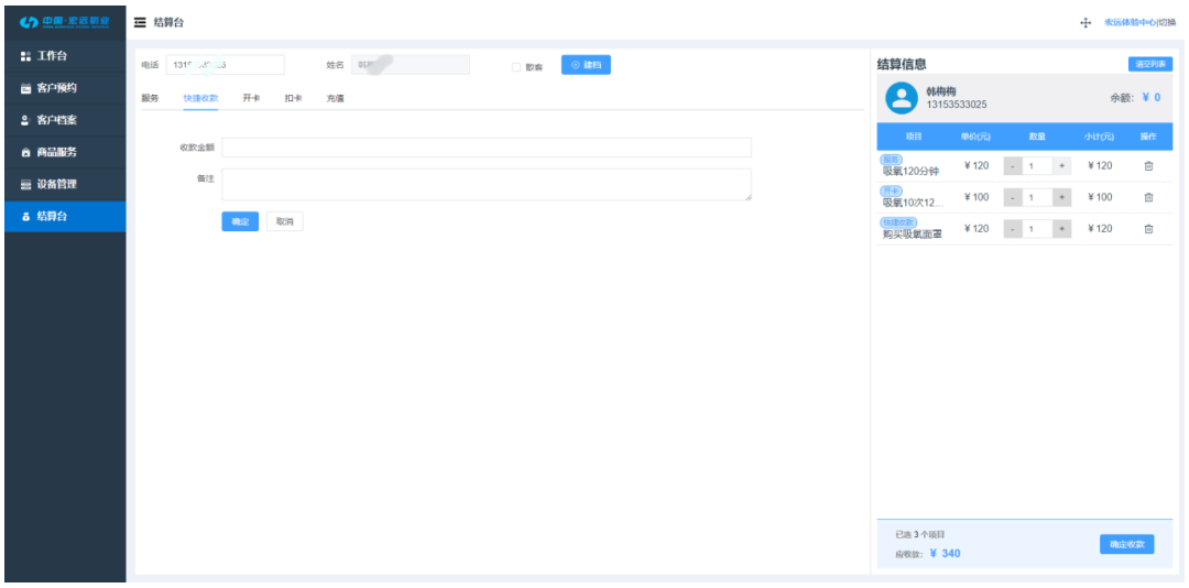 含服务扣款、快捷收款、会员开卡、会员扣卡、会员充值五大功能,所有结算在一个界面完成,简单易用