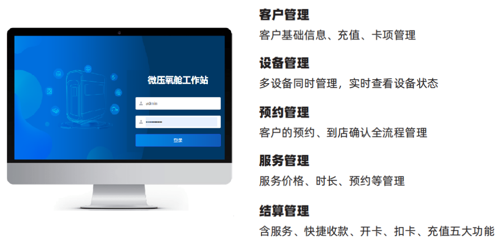 为美容院、养老院、康复中心、机场、酒店等集中式微压氧舱工作站,提供全流程的开店运营一体化软硬件运营解决方案。